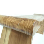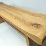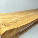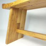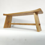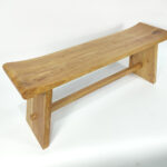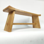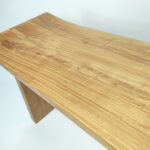De zitting is geïnspireerd op de iconische vorm van een Japanse Torii, een poort die symbool staat voor overgang en sereniteit. Deze subtiele, gebogen vorm van de zitting geeft het bankje een elegante uitstraling en zorgt voor extra comfort. Het warme, natuurlijke iepenhout toont prachtige houtnerven en kleurschakeringen, die bijdragen aan een authentieke en natuurlijke look. De taps toelopende poten zijn stevig bevestigd en worden ondersteund door een tussenbalk, wat zorgt voor extra stevigheid en een langdurig gebruik.